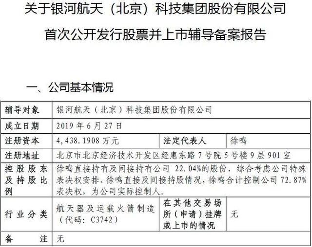 备案报告显示,银河航天成立于2019年6月27日,注册资本4438.1908万元,注册地址为北京经济技术开发区,公司创始人、董事长兼CEO徐鸣直接持有及间接持有公司22.04%的股份,综合考虑公司特殊表决权安排、徐鸣直接及间接持股情况,徐鸣合计控制公司72.87%表决权,为公司实控人。