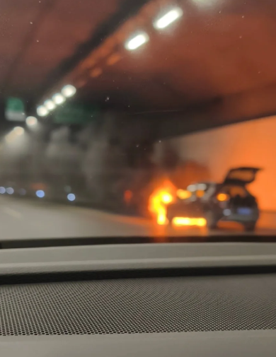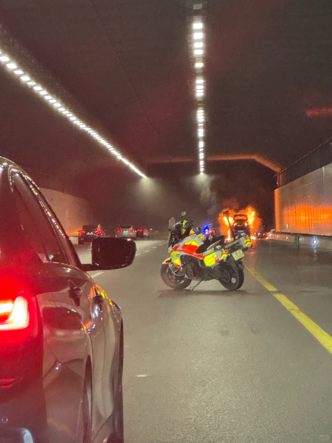 交警、消防部门第一时间到场处置,现场明火已扑灭。目前,交警正在隧道东行入口分流疏导,请广大车友服从现场指挥,有序通行。