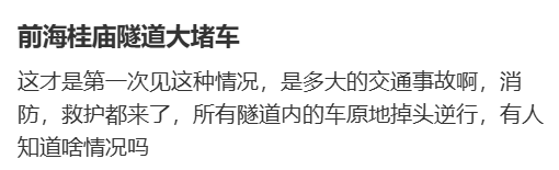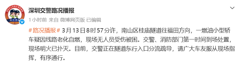 据@深圳交警路况播报 消息,3月13日8时57分许,南山区桂庙隧道往福田方向,一燃油小型轿车疑因线路老化自燃,现场无人员受伤被困。